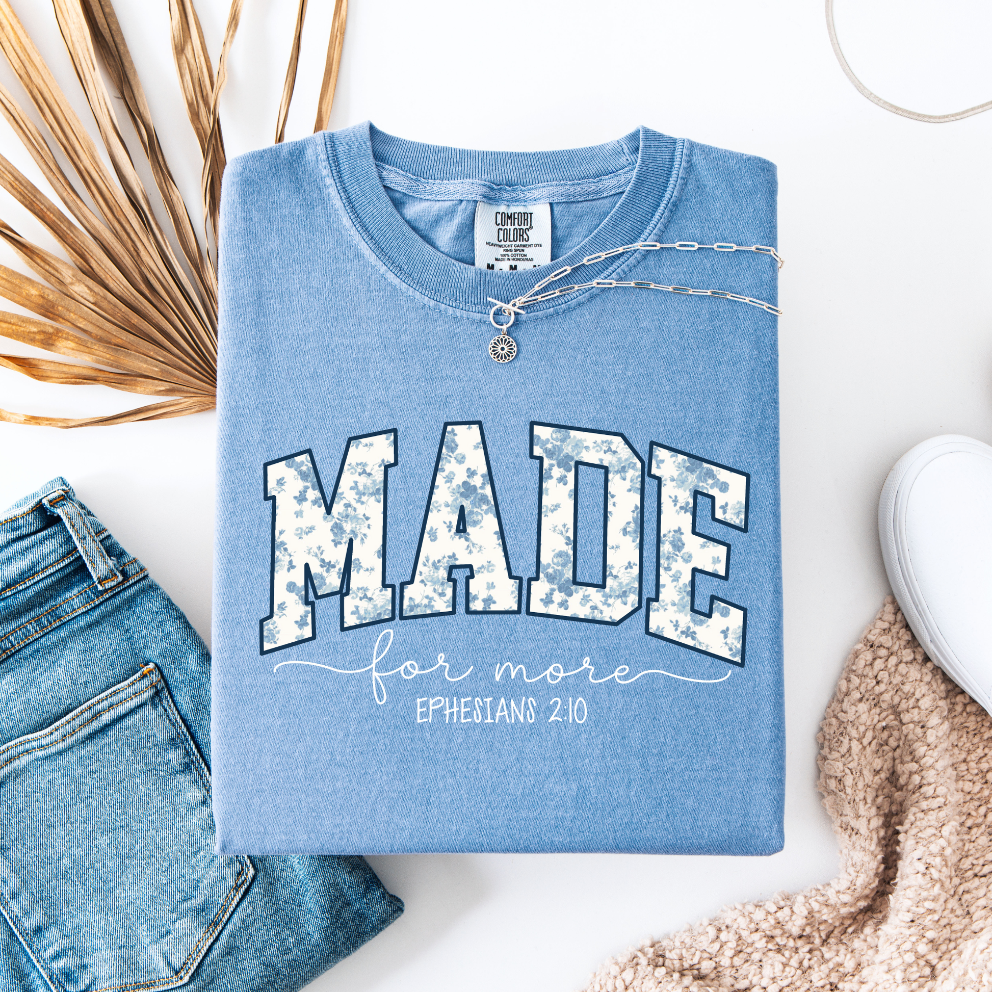 A soft, faith-inspired tee designed to remind you of your purpose. Featuring a floral varsity-style “Made” with delicate script details, this Comfort Colors shirt is cozy, flattering, and easy to style year-round.